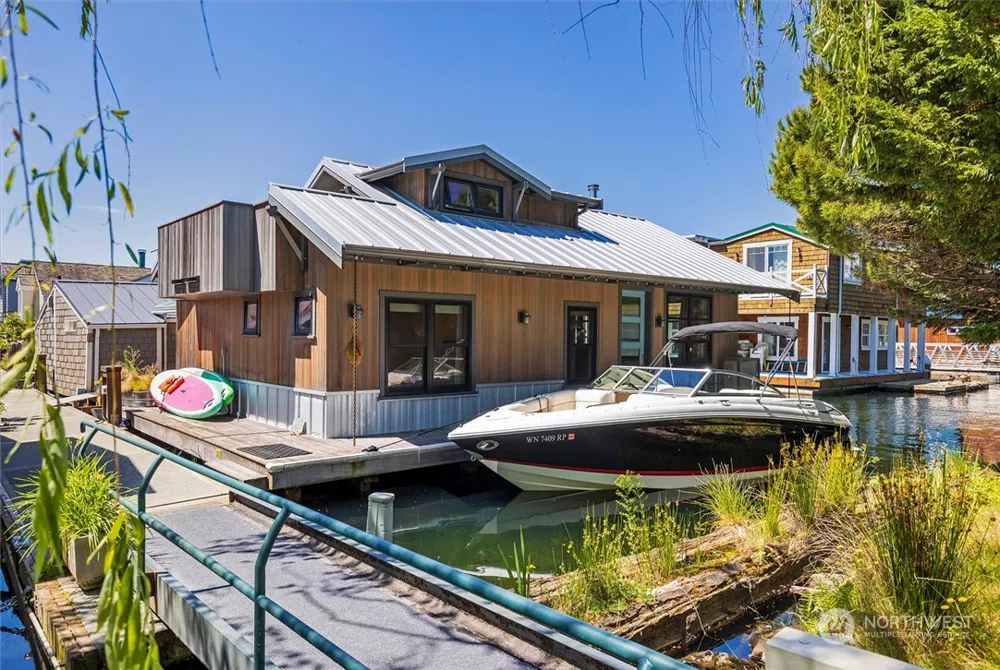 Amazing contemporary paradise. Beautiful wood combination with steel and stainless finishes. Technically 1 bedroom, but beautiful sleeping loft with big closet and multi use space on main...could be sleeping space, office, or toy room! Fresh paint, new carpet, and amazing views from roof deck. Owner had 26' boat parked in front!! Condo dock with inexpensive dues that include water, sewer, garbage. A paradise in town. Also listed for sale.