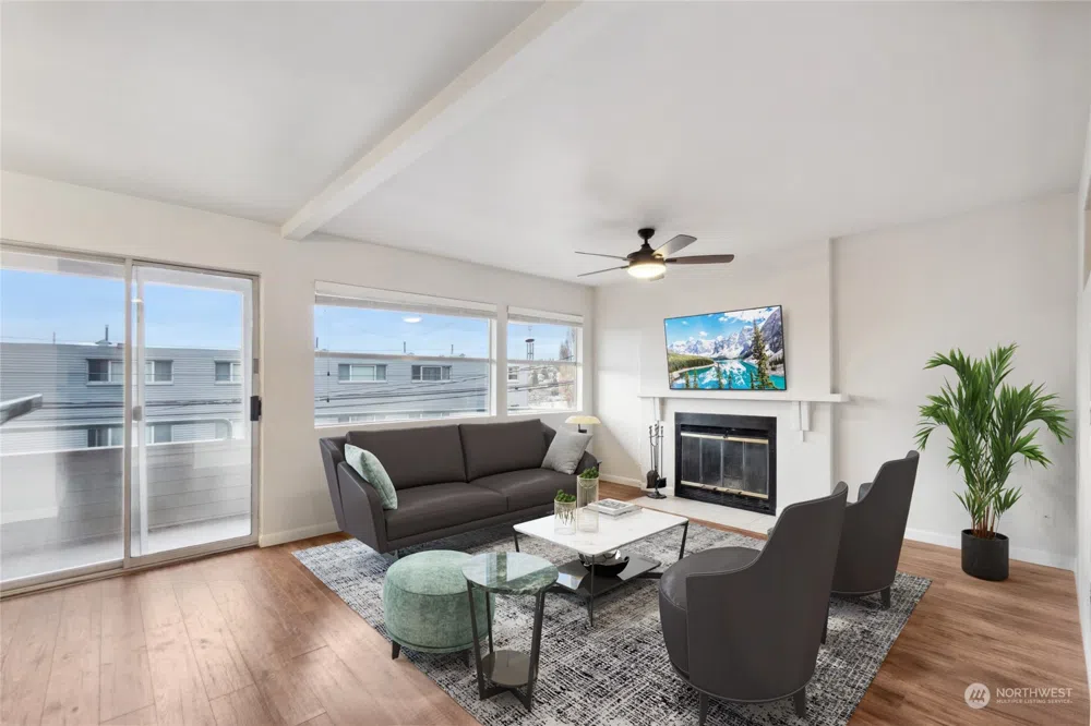 Bright and spacious 1 bed/1 full bath condo in fantastic Eastlake location. Private balcony with large storage closet attached, wood burning fireplace, engineered wood flooring, brand new carpet, fresh new paint throughout, granite counters and in-unit laundry! 1 assigned parking space. Partial view of South Lake Union. Quiet location with easy access to transit, Facebook, Amazon, downtown, freeway, shops, restaurants and more.